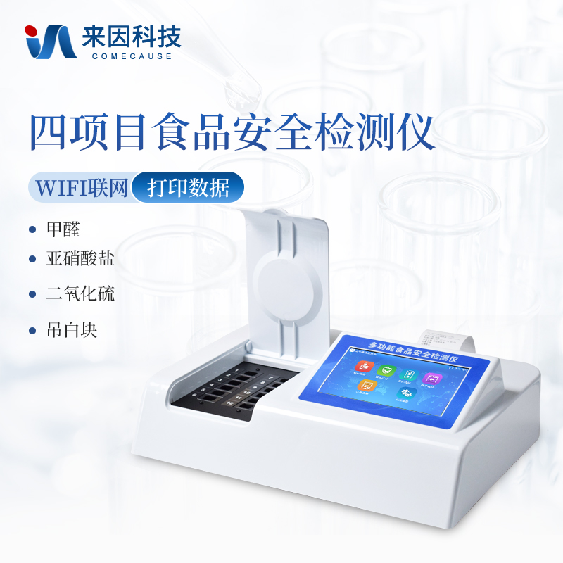 可快速检测各类食品中的甲醛、二氧化硫、亚硝酸盐、吊白块的含量,仪器预留其他项目检测程序和端口,根据日后需求可方便的自主增加检测项目。
