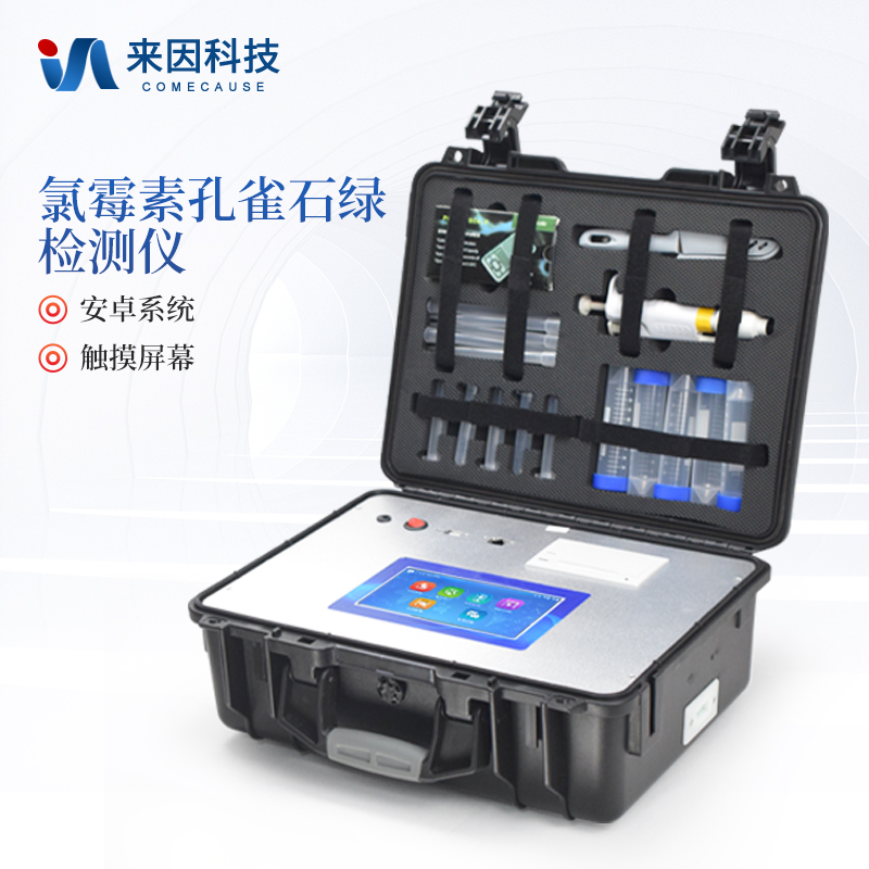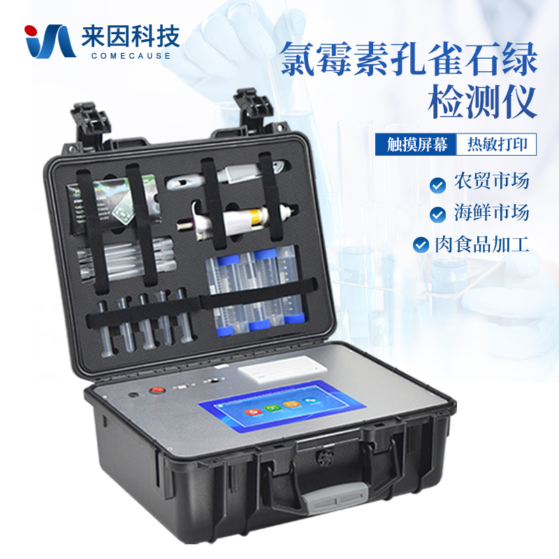 该设备可快速检测鱼、虾等水产类中的氯霉素、孔雀石绿残留,氯霉素快速检测卡整个检测过程只需要30分钟左右, 灵敏度为 0.3 μg/kg (ppb)。该快速检测系统设备为集成化食品安全快速检测分析设备,广泛应用于农贸市场、食品肉产品深加工企业、食药监局、卫生部门、水产养殖场、检验检疫部门、农业部门等单位使用。