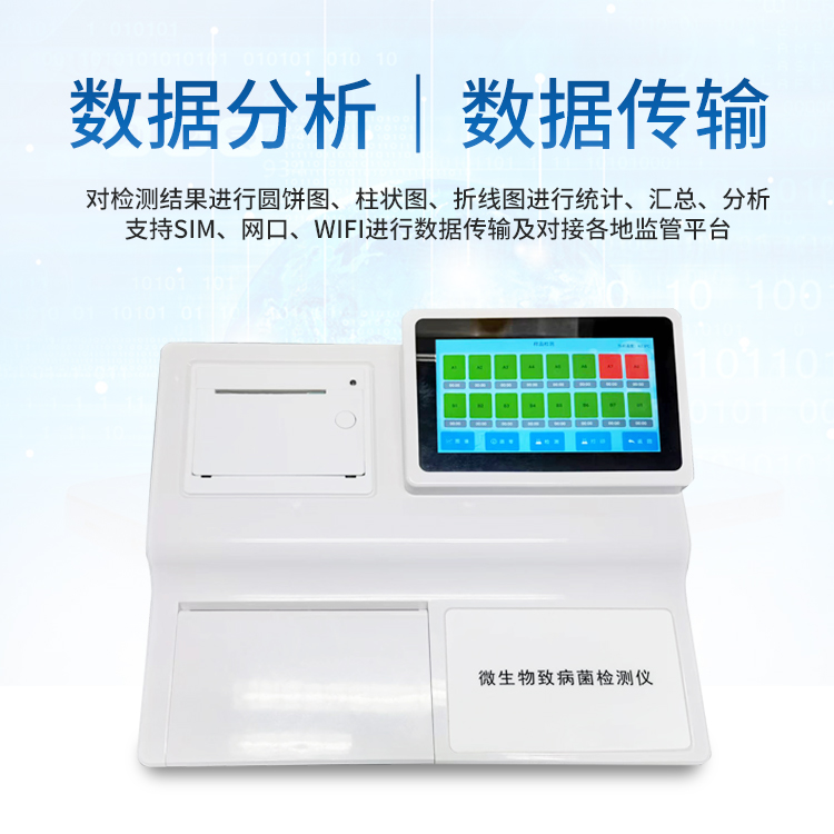 25、打印功能:内置热敏打印机,可通过USB B型外链打印机,单条或多条数据合并打印,可打印检测结果检测报告可打印检测项目、样品名称、检测结果、结果判断、检测日期 、检测单位、检验人员、被检测单位等信息;USB B型接口可连接A4打印机打印结果