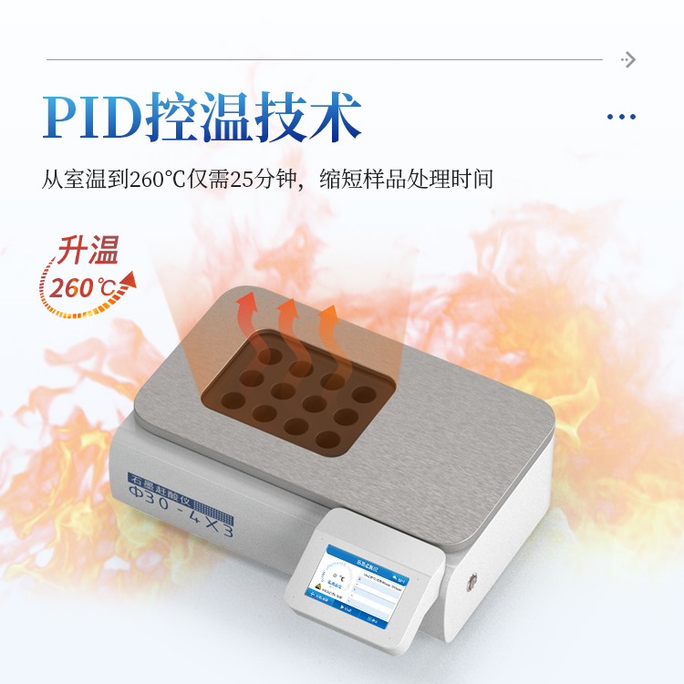 采用PID 控温技术,控温精度高,升温速度快, 从室温到260℃仅需25分钟。使用5寸彩色触摸屏进行仪器操作,配备安卓操作系统,方便快捷。