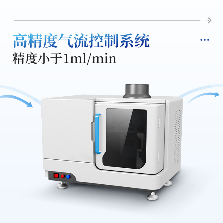 仪器采用高精度质量流量控制器进行气体流量控制,精度小于 1ml/min。同时具备异常情况保护功能,仪器非工作状态下自动切断气源,节省气体用量。