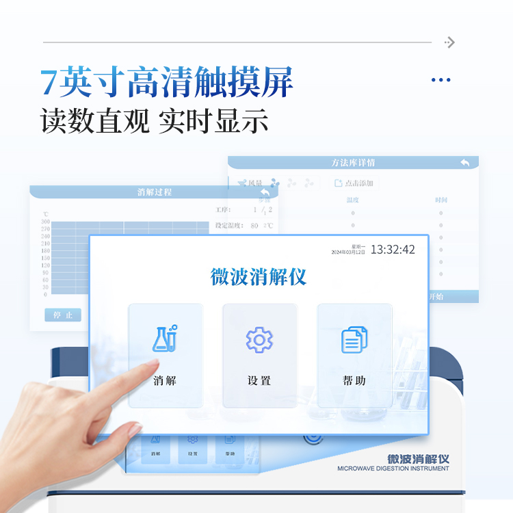 温度控制系统:非接触式红外控温,实时检测控制并显示微波消解反应罐内的温度和曲线。